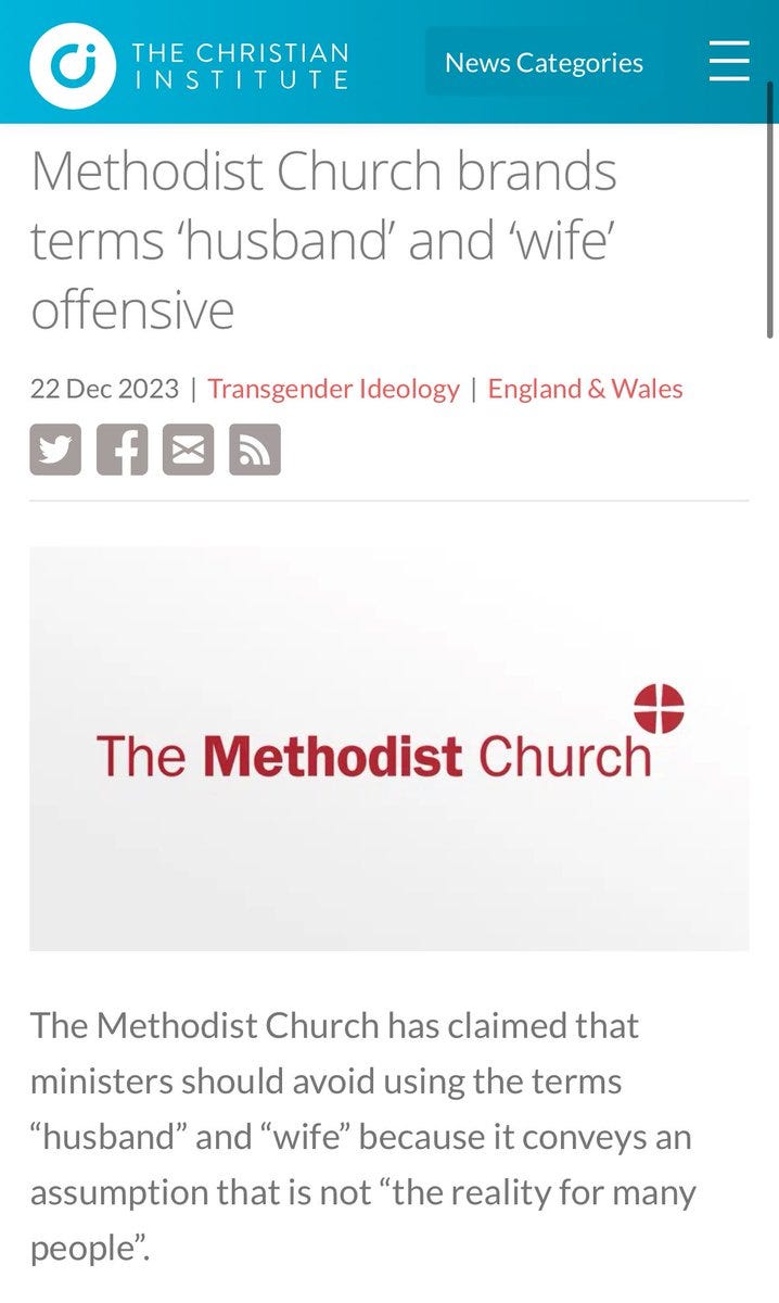 The Methodist Church brands terms 'husband' and 'wife' offensive.